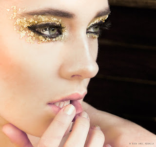Joni. I was really inspired by these thigh high gold boots Ruben put her in for the first look. I created a heavy, smokey brow that extended down to her nose, a dash of gold glitter underneath her brows and topped it off with a classic matte black lip.